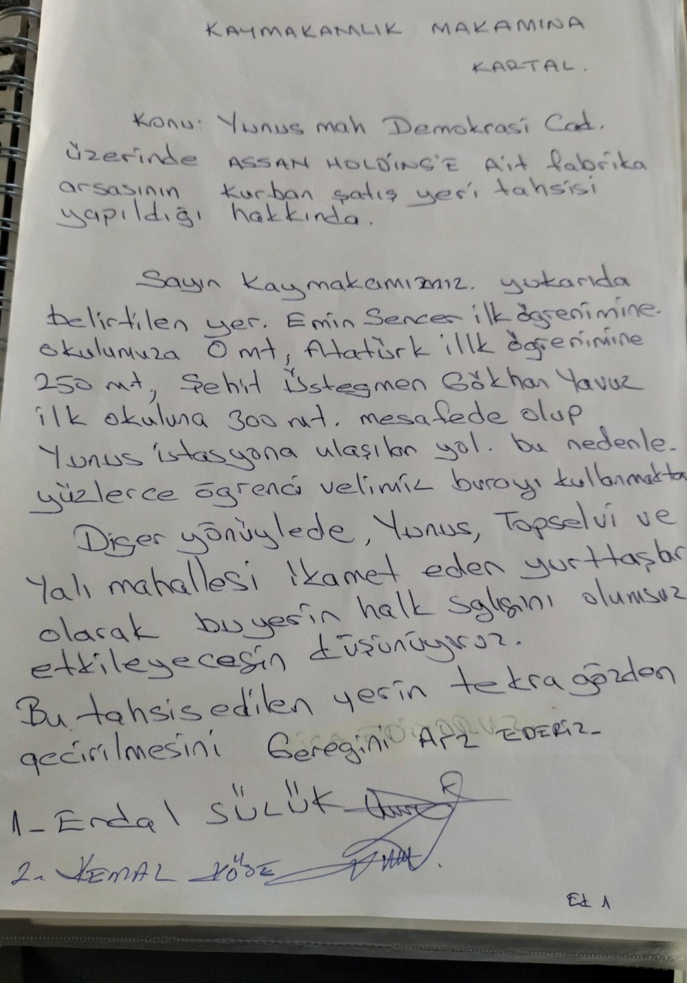 Karara tepki gösteren mahalle sakinleri imza kampanyası başlatarak taleplerini Kartal Kaymakamlığı’na iletti. Vatandaşlar, kesim alanının başka bir noktaya taşınmasını isterken, yetkililerin süreci yeniden değerlendirmesini talep etti.
